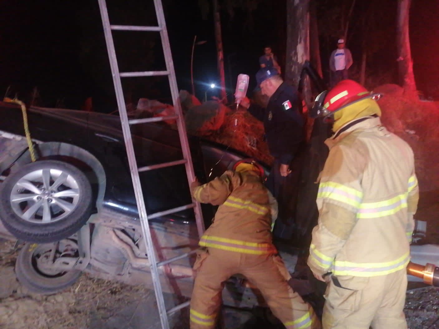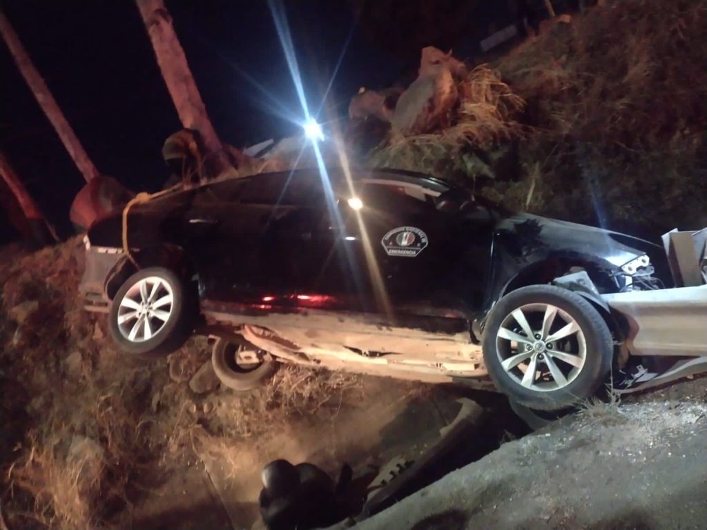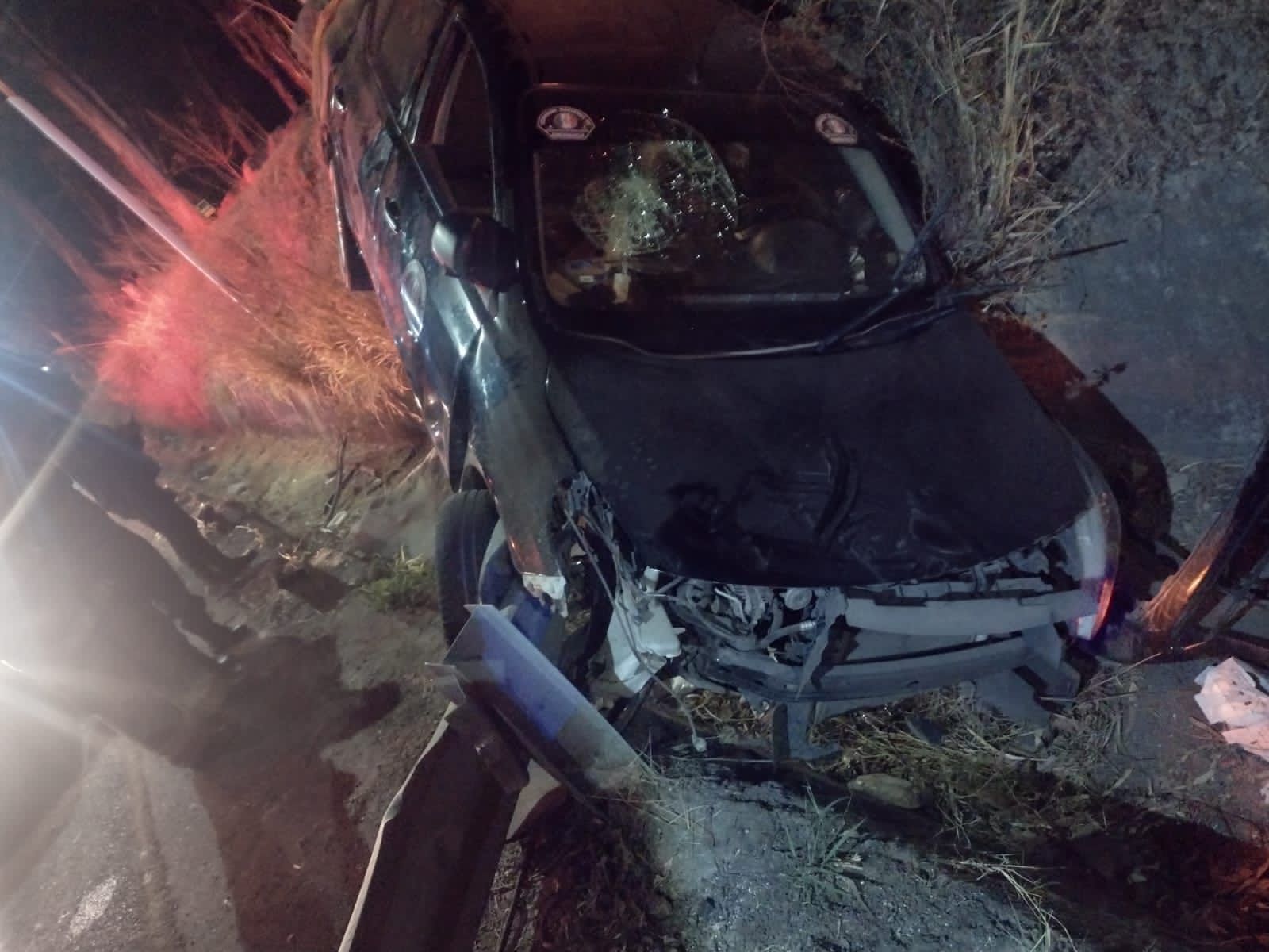 Personal de Protección Ciudadana y Bomberos en conjunto con la Policía Estatal de Caminos acudieron al sitio donde se encontró volcado e impactado contra la barra de contención a un vehículo de la marca Nissan, en color negro, con una femenina prensada al interior del vehículo.