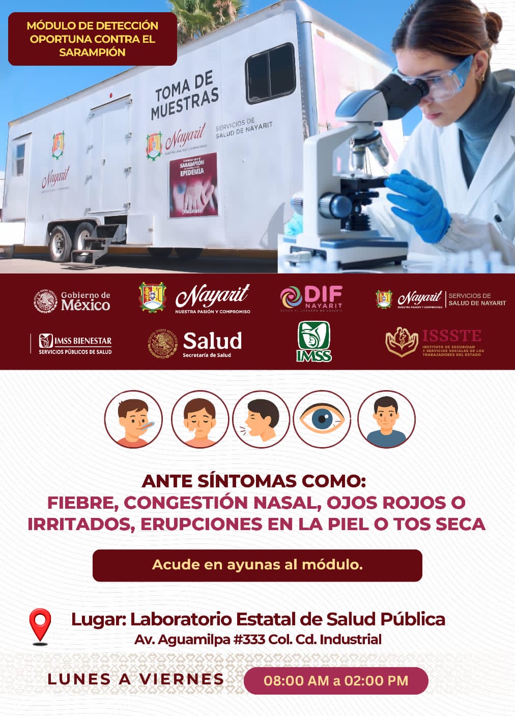 El Gobierno del Estado, a través de los Servicios de Salud de Nayarit y en coordinación con el Gobierno de México, mantiene activo el módulo de detección oportuna contra el sarampión para niñas y niños de hasta 9 años y personas adultas de 49 años o menos.