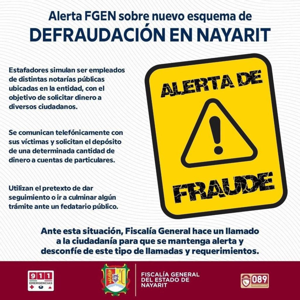 Fiscalía General del estado de Nayarit informa a la sociedad en general sobre un nuevo esquema de defraudación que ha sido descubierto en los últimos días, siendo este que estafadores simulan ser empleados de distintas notarías públicas ubicadas en la entidad, con el objetivo de solicitar dinero a diversos ciudadanos.