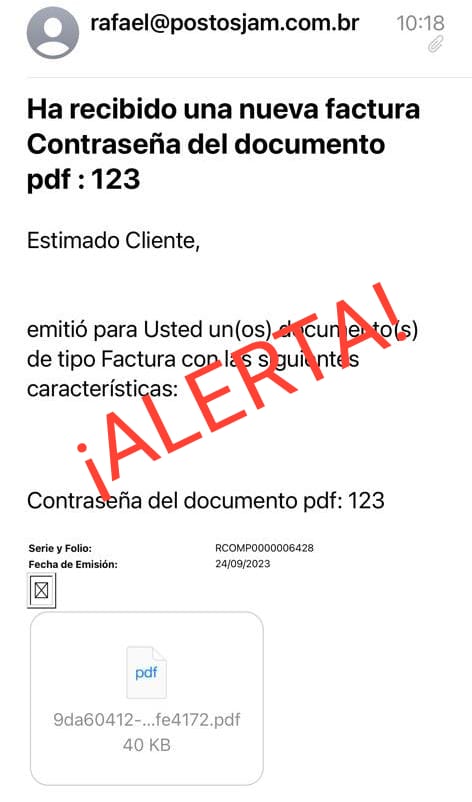 Cuando el usuario descarga la supuesta factura, se descarga el malware en su dispositivo.