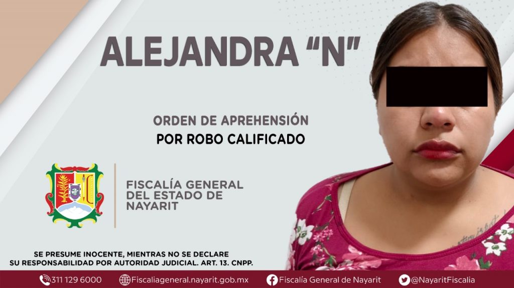 Elementos de la Agencia de Investigación Criminal dieron cumplimiento a una orden de aprehensión en el municipio de Xalisco contra Alejandra “N”, por su probable participación en hechos que la ley juzga como delito de robo calificado, cometido en perjuicio de una persona de sexo femenino cuya identidad se reserva.