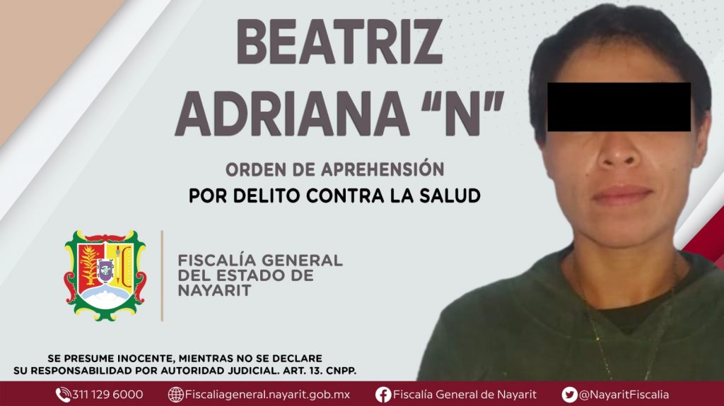 La Fiscalía General de Nayarit a través de la Agencia de Investigación Criminal dio cumplimiento a una orden de aprehensión en la ciudad de Tepic contra Beatriz Adriana “N”, por su presunta participación en hechos que según apreciación de la ley encuadran el delito contra la salud en su modalidad de narcomenudeo -en su hipótesis de posesión de psicotrópicos (metanfetamina)-, cometido en agravio de la sociedad.