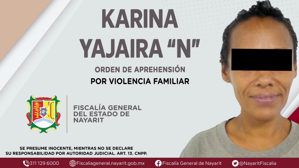 Elementos de la Agencia de Investigación Criminal de Nayarit ejecutaron una orden de aprehensión en la ciudad de Tepic contra Karina Yajaira “N”, por su presunta participación en hechos que según apreciación de la ley encuadran el delito de violencia familiar, cometido en agravio de una mujer de identidad reservada.