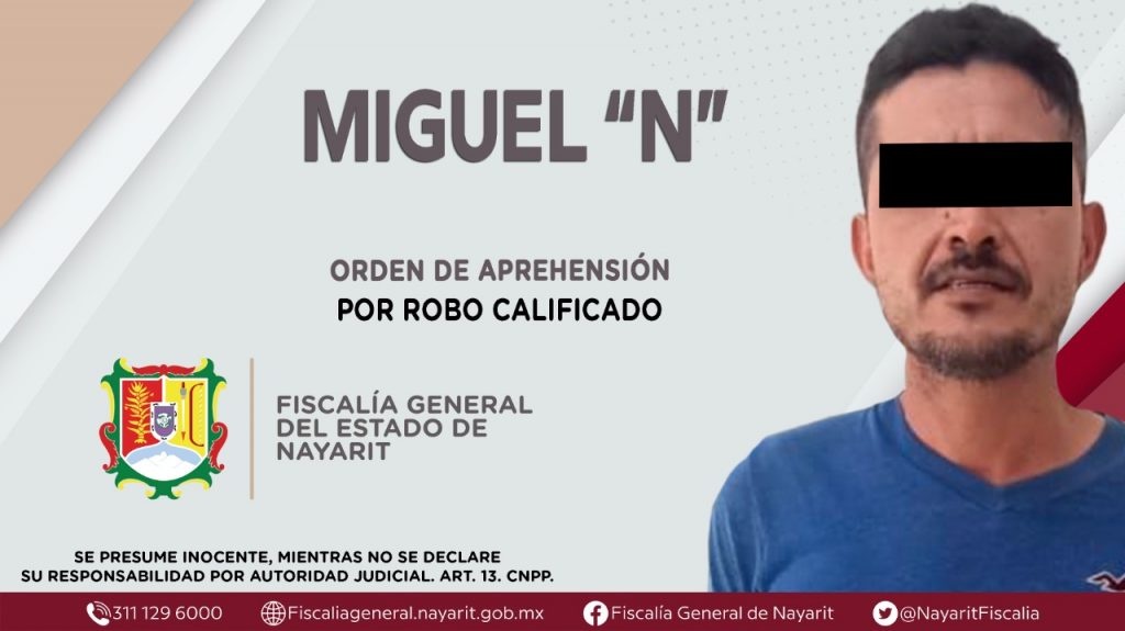 En el interior del municipio de Acaponeta, la Fiscalía General de Nayarit a través de la Agencia de Investigación Criminal dio cumplimiento a una nueva orden de aprehensión contra Miguel “N”, por su presunta participación en hechos que según apreciación de la ley encuadran el delito de robo calificado, cometido en agravio de dos personas -una de sexo masculino y otra de sexo femenino-, cuyas identidades son reservadas.