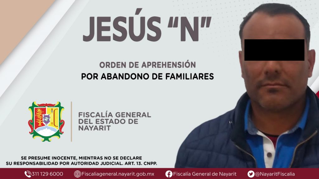 La Fiscalía General de Nayarit a través de la Agencia de Investigación Criminal dio cumplimiento a una orden de aprehensión en el municipio de Bahía de Banderas contra Jesús “N”, por su presunta participación en hechos que según apreciación de la ley encuadran el delito de abandono de familiares, cometido en agravio de tres personas menores de dieciocho años de identidades reservadas.