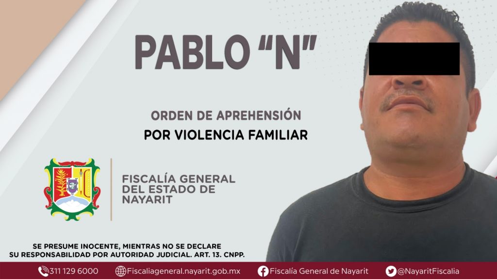 La Fiscalía General del Estado a través de la Agencia de Investigación Criminal dio cumplimiento a una orden de aprehensión en el municipio de Bahía de Banderas contra Pablo “N”, por su presunta participación en hechos que según apreciación de la ley configuran el delito de violencia familiar, cometido en agravio de una mujer de identidad reservada.