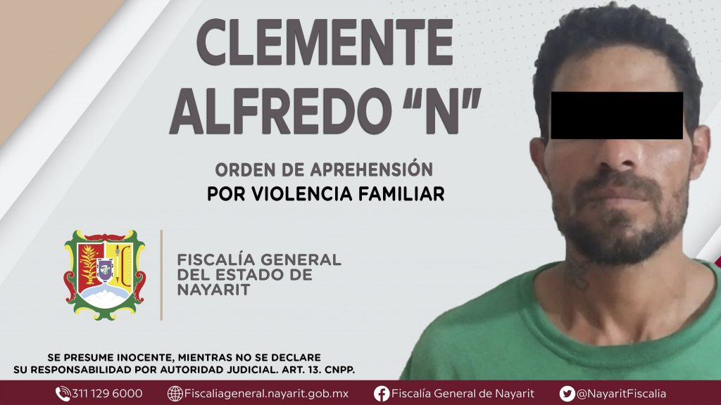 La Fiscalía General del Estado a través de la Agencia de Investigación Criminal dio cumplimiento a una orden de aprehensión en el municipio de Huajicori contra Clemente Alfredo “N”, por su presunta participación en hechos que según apreciación de la ley configuran el delito de violencia familiar, cometido en contra de una persona de sexo masculino de identidad reservada.