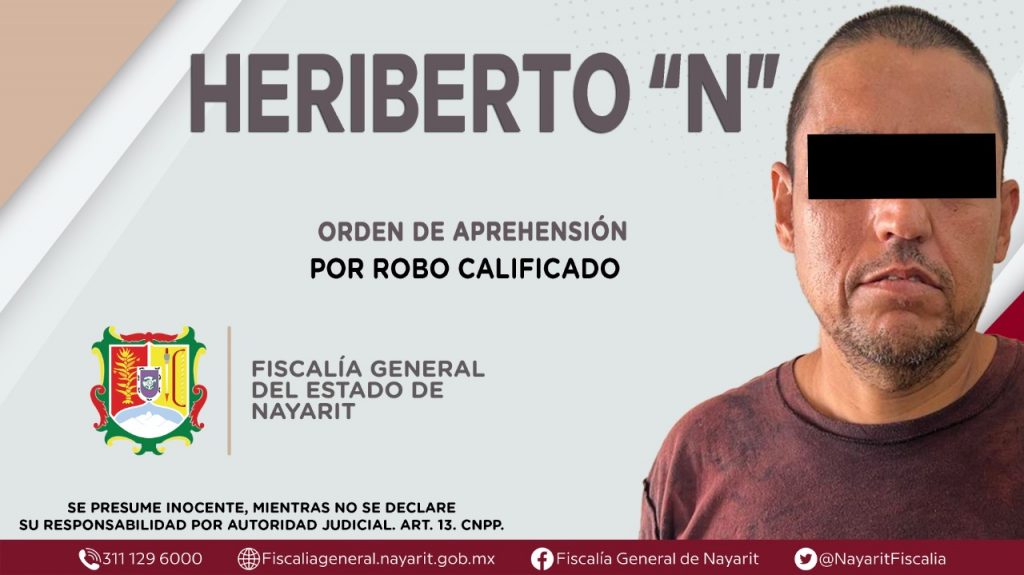 La Fiscalía General del Estado a través de la Agencia de Investigación Criminal cumplimentó una orden de aprehensión en el municipio de Ruiz contra Heriberto “N”, por su presunta participación en hechos que bajo la apreciación de la ley configuran el delito de robo calificado, cometido en perjuicio de una persona de sexo femenino de identidad reservada.