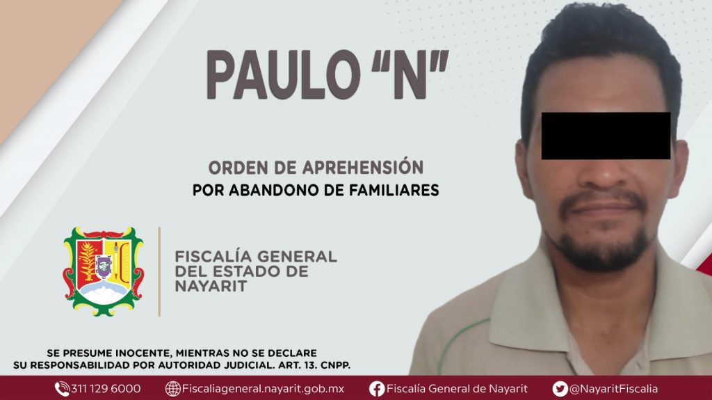 La Fiscalía General del Estado a través de la Agencia de Investigación Criminal dio cumplimiento a una orden de aprehensión en el municipio de Santiago Ixcuintla contra Paulo “N”, por su presunta participación en hechos que según apreciación de la ley encuadran el delito de abandono de familiares, cometido en perjuicio de dos niños de identidades reservadas.