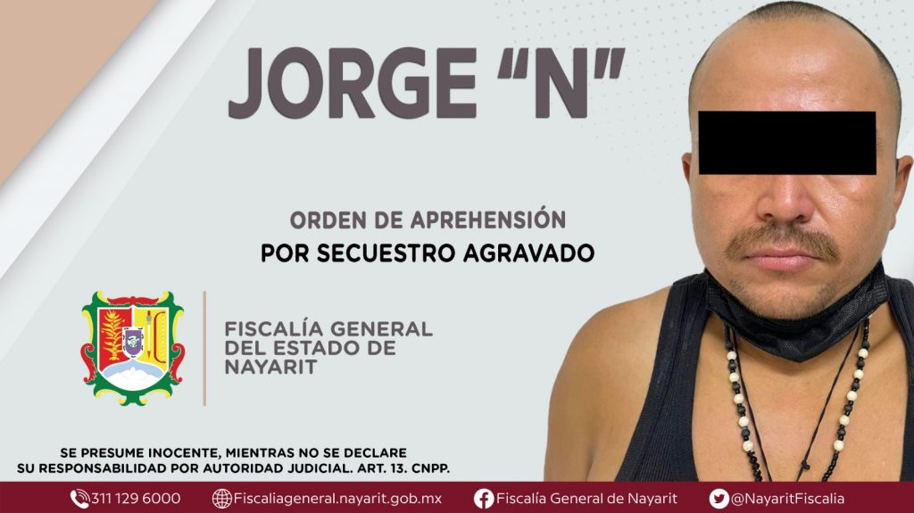La Fiscalía General de Nayarit a través de la Agencia de Investigación Criminal dio cumplimiento a una orden de aprehensión en el poblado Estación Yago, municipio de Santiago Ixcuintla contra Jorge “N”, por su presunta participación en hechos que según apreciación de la ley encuadran el delito de secuestro agravcado, en agravio de una persona de identidad reservada.
