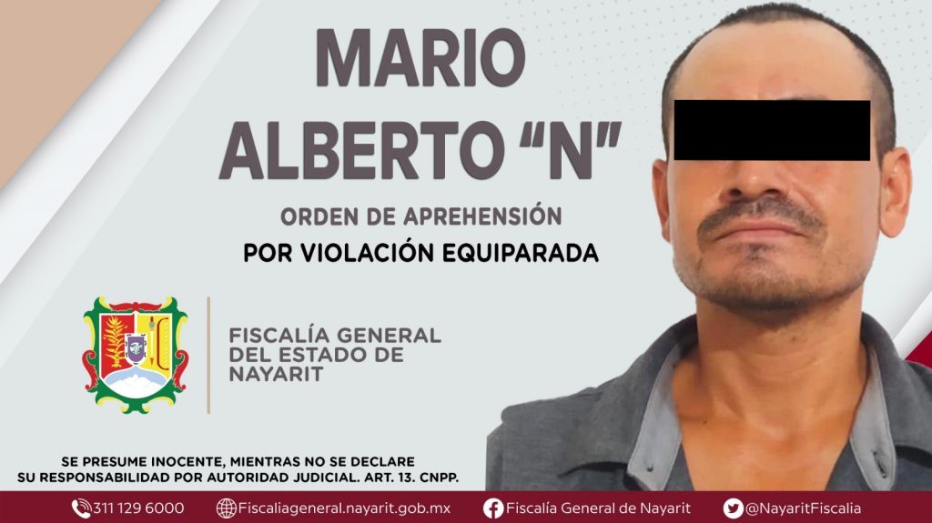 La Fiscalía General del Estado a través de la Agencia de Investigación Criminal dio cumplimiento a una orden de aprehensión en la localidad El Capomo, municipio de Santiago Ixcuintla contra Mario Alberto “N”, por su presunta participación en hechos que según apreciación de la ley encuadran el delito de violación equiparada.
