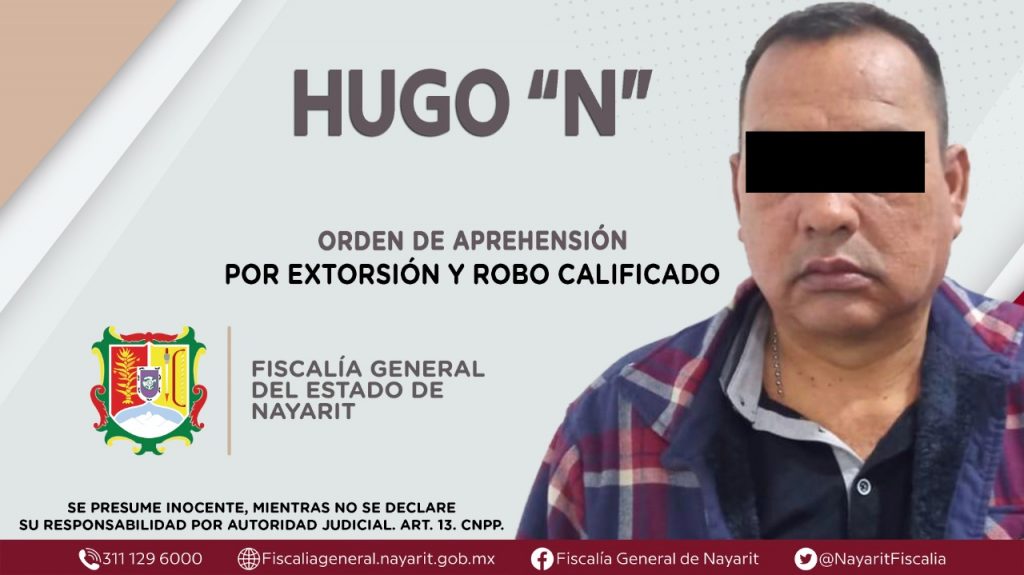 Elementos de la Agencia de Investigación Criminal dieron cumplimiento a una orden de aprehensión en el municipio de Tecuala contra Hugo “N”, por su presunta participación en hechos que bajo la apreciación de la ley configuran los delitos de extorsión y robo calificado, cometidos en agravio de una persona de sexo femenino de identidad reservada.
