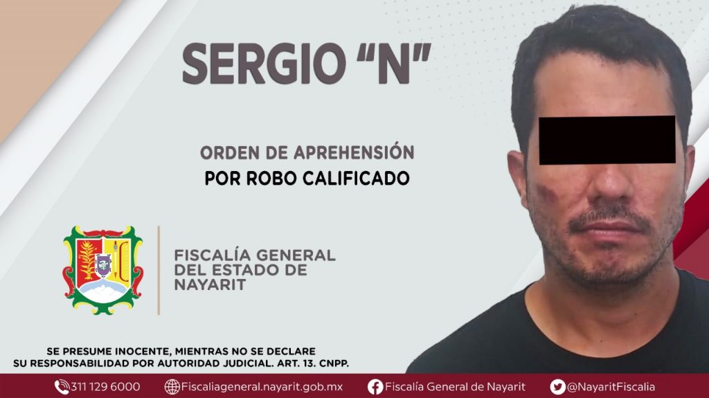 La Fiscalía General de Nayarit a través de la Agencia de Investigación Criminal cumplimentó en la capital nayarita una orden de aprehensión contra Sergio “N”, por su probable responsabilidad penal en hechos que según valoración de la ley configuran el delito de robo calificado, cometido en agravio del patrimonio de una persona de sexo masculino de identidad reservada.