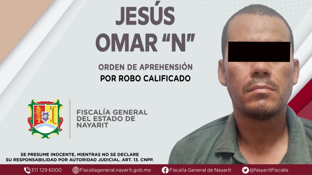Elementos de la Agencia de Investigación Criminal cumplimentaron una orden de aprehensión en la ciudad de Tepic contra Jesús Omar “N”, por su presunta participación en hechos que la ley juzga como delito de robo calificado, siendo la afectada una persona de sexo masculino cuya identidad se reserva.