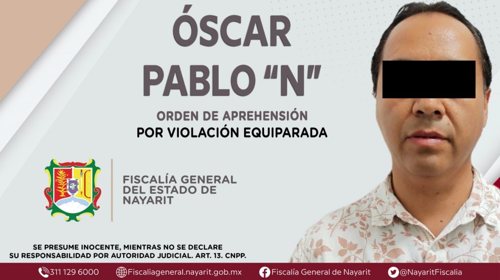 La Fiscalía General del Estado a través de la Agencia de Investigación Criminal dio cumplimiento a una orden de aprehensión en la ciudad de Tepic contra Óscar Pablo “N”, por su presunta participación en hechos que según valoración de la ley configuran el delito de violación equiparada, cometido en agravio de la intimidad sexual de una adolescente de identidad reservada.
