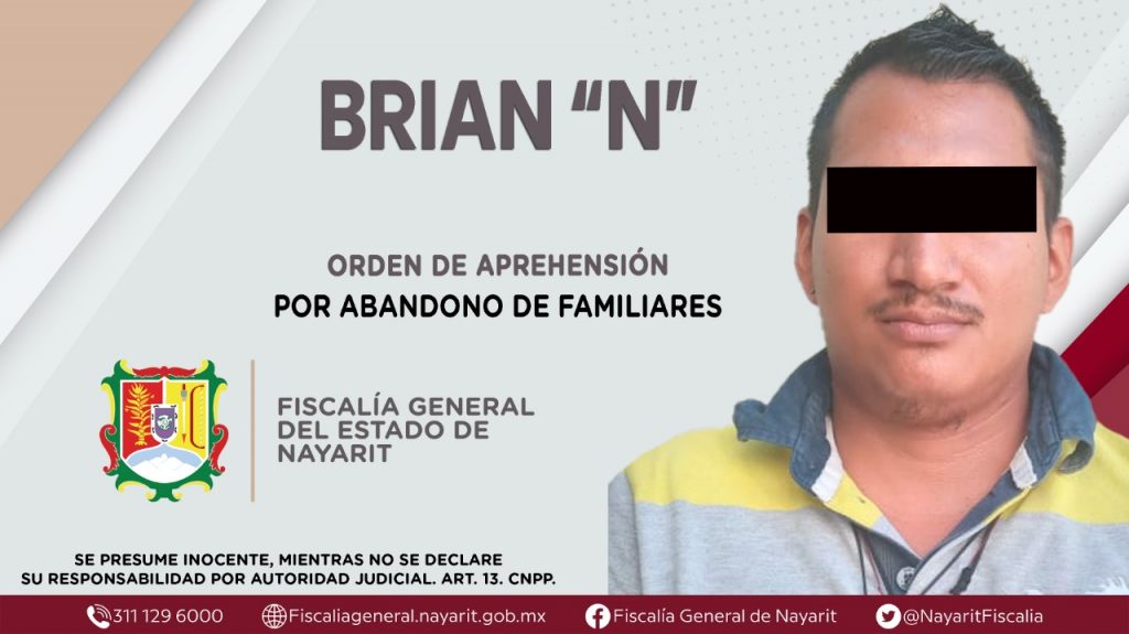La Fiscalía General de Nayarit a través de la Agencia de Investigación Criminal ejecutó una orden de aprehensión contra Brian “N”, por su presunta participación en hechos que según apreciación de la ley encuadran el delito de abandono de familiares, ilícito en agravio de tres menores de edad cuyas identidades se reservan.
