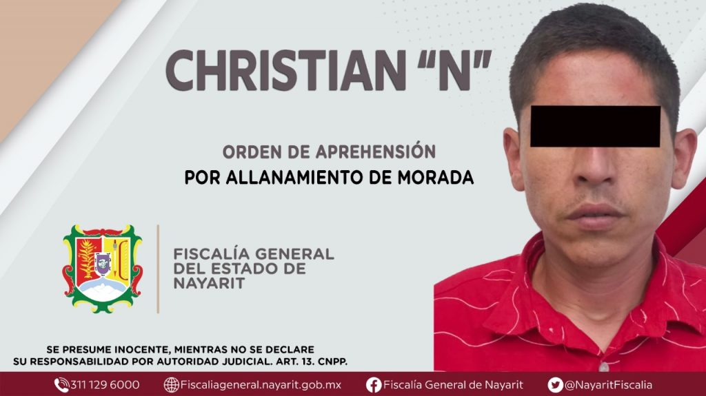 En colaboración con la Fiscalía General del estado de Baja California, elementos de la Agencia de Investigación Criminal de Nayarit dieron cumplimiento en la ciudad de Tepic a una orden de aprehensión que se obsequió contra Christian “N”, por su tentativa participación en hechos que la ley califica como delito de allanamiento de morada, por hechos cometidos en la ciudad de Mexicali, Baja California.