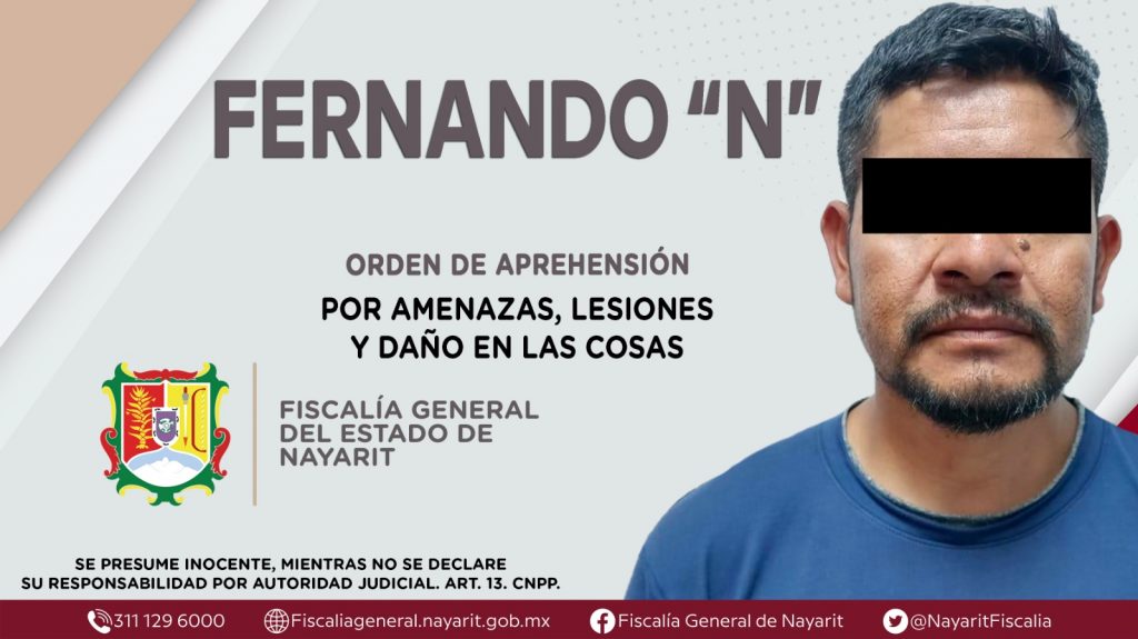 La Fiscalía General del Estado a través de la Agencia de Investigación Criminal dio cumplimiento a una orden de aprehensión en la capital nayarita contra Fernando “N”, por su presunta participación en hechos que según valoración de la ley configuran los delitos de amenazas, lesiones y daño en las cosas, en agravio de una persona de sexo masculino de identidad reservada