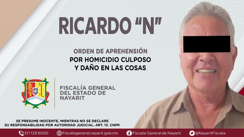 La Fiscalía General del Estado a través de la Agencia de Investigación Criminal dio cumplimiento a una orden de aprehensión en la ciudad de Tepic contra Ricardo “N”, por su presunta participación en hechos que según apreciación de la ley configuran los delitos de homicidio culposo y daño en las cosas, el primero cometido en agravio de una persona de sexo masculino, en tanto el segundo en contra de la empresa Servicio Apolo, S. A. de C. V.