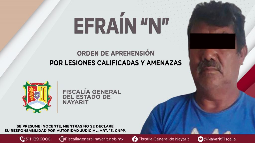 La Fiscalía General de Nayarit a través de la Agencia de Investigación Criminal ejecutó una orden de aprehensión en el poblado El Corte, municipio de Santiago Ixcuintla contra Efraín “N”, por su presunta participación en hechos que según apreciación de la ley encuadran los delitos de lesiones calificadas y amenazas, cometidos en agravio de una persona de sexo masculino de identidad reservada.