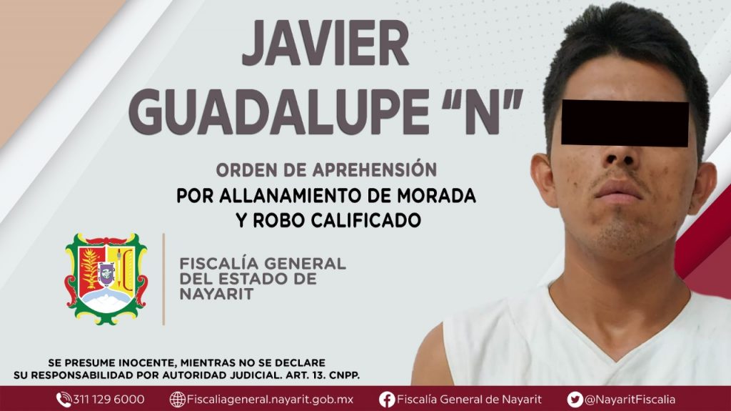 La Fiscalía General de Nayarit a través de la Agencia de Investigación Criminal ejecutó una orden de aprehensión en la localidad Valle de Banderas, municipio de Bahía de Banderas contra Javier Guadalupe “N”, por su presunta participación en hechos que según apreciación de la ley encuadran los delitos de robo calificado y allanamiento de morada en domicilio de persona moral pública, cometidos en agravio de la Universidad Tecnológica del municipio de Bahía de Banderas.