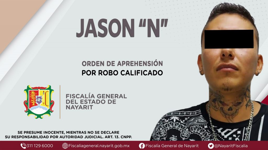 La Fiscalía General del Estado a través de la Agencia de Investigación Criminal dio cumplimiento a una orden de aprehensión en la ciudad de Tepic contra Jason “N”, por su presunta participación en hechos que según apreciación de la ley configuran el delito de robo calificado, cometido en perjuicio de la cadena comercial Oxxo, S. A. de C. V.
