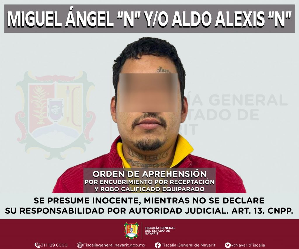 Elementos de la Agencia de Investigación Criminal de Nayarit ejecutaron una orden de aprehensión en la ciudad de Tepic contra Miguel Ángel “N” y/o Aldo Alexis “N”, por su presunta participación en hechos que según apreciación de la ley encuadran los delitos de encubrimiento por receptación y robo calificado equiparado, cometidos en agravio de la sociedad.