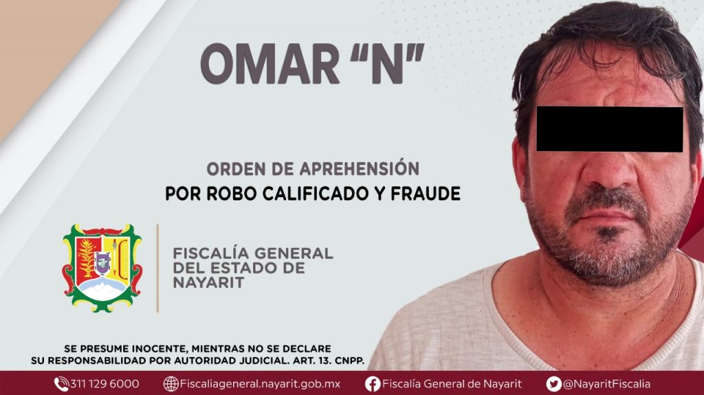 Elementos de la Agencia de Investigación Criminal de Nayarit dieron cumplimiento a una orden de aprehensión en la ciudad de Tepic contra Omar “N”, por su probable participación en hechos que la ley encuadra como delitos de robo calificado y fraude, cometidos en agravio de una persona de sexo masculino de identidad reservada.
