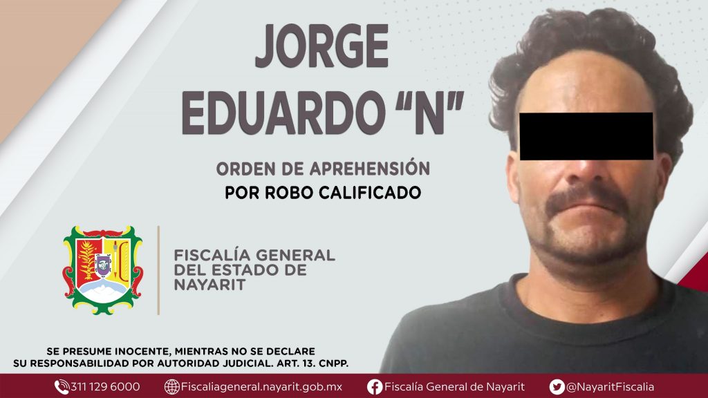 Elementos de la Agencia de Investigación Criminal de Nayarit ejecutaron una orden de aprehensión en la ciudad de Tepic contra Jorge Eduardo “N”, por su presunta participación en hechos que según apreciación de la ley encuadran el delito de robo calificado, cometido en contra del patrimonio de una persona de sexo masculino de identidad reservada.