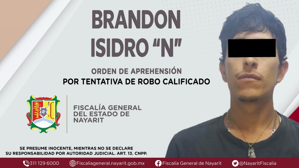 Elementos de la Agencia de Investigación Criminal de Nayarit ejecutaron una orden de aprehensión en la ciudad de Tepic contra Brandon Isidro “N”, por su presunta participación en hechos que según apreciación de la ley encuadran el delito de tentativa de robo calificado, cometido en agravio del Ayuntamiento de Tepic.