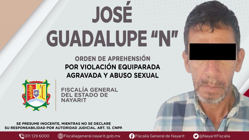 La Fiscalía General del Estado a través de la Agencia de Investigación Criminal dio cumplimiento a una orden de aprehensión en la ciudad de Tepic contra José Guadalupe “N”, por su presunta participación en hechos que según apreciación de la ley configuran los delitos de violación equiparada agravada y abuso sexual, cometidos en agravio de una niña de identidad reservada.