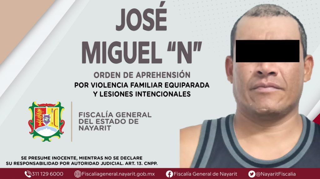 La Fiscalía General del Estado a través de la Agencia de Investigación Criminal dio cumplimiento a una orden de aprehensión en la ciudad de Tepic contra José Miguel “N”, por su presunta participación en hechos que según apreciación de la ley encuadran los delitos de violencia familiar equiparada y lesiones intencionales, cometidos en agravio de una mujer de identidad reservada.