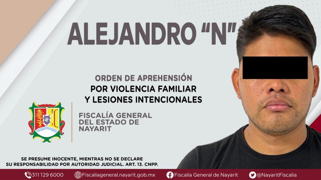 La Fiscalía General del Estado a través de la Agencia de Investigación Criminal dio cumplimiento a una orden de aprehensión en la ciudad de Tepic contra Alejandro “N”, por su presunta participación en hechos que según valoración de la ley configuran los delitos de violencia familiar y lesiones intencionales, cometidos en agravio de una mujer de identidad reservada.