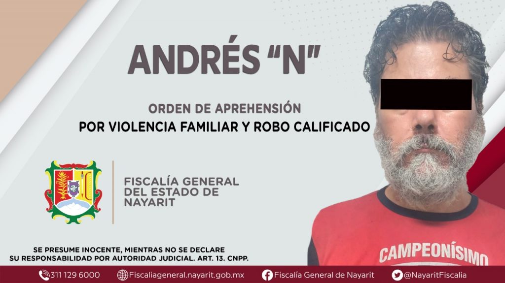 La Fiscalía General de Nayarit a través de la Agencia de Investigación Criminal ejecutó una orden de aprehensión contra Andrés “N”, por su presunta participación en hechos que según apreciación de la ley encuadran los delitos de violencia familiar y robo calificado, ilícitos en agravio de una persona de sexo masculino cuya identidad es reservada.