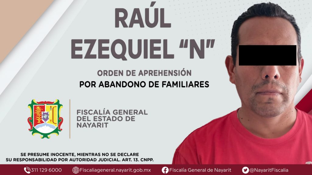 La Fiscalía General de Nayarit a través de la Agencia de Investigación Criminal dio cumplimiento a una orden de aprehensión en la ciudad de Tepic contra Raúl Ezequiel “N”, por su presunta participación en hechos que según apreciación de la ley encuadran el delito de abandono de familiares, cometido en agravio de cuatro personas menores de dieciocho años de identidades reservadas.