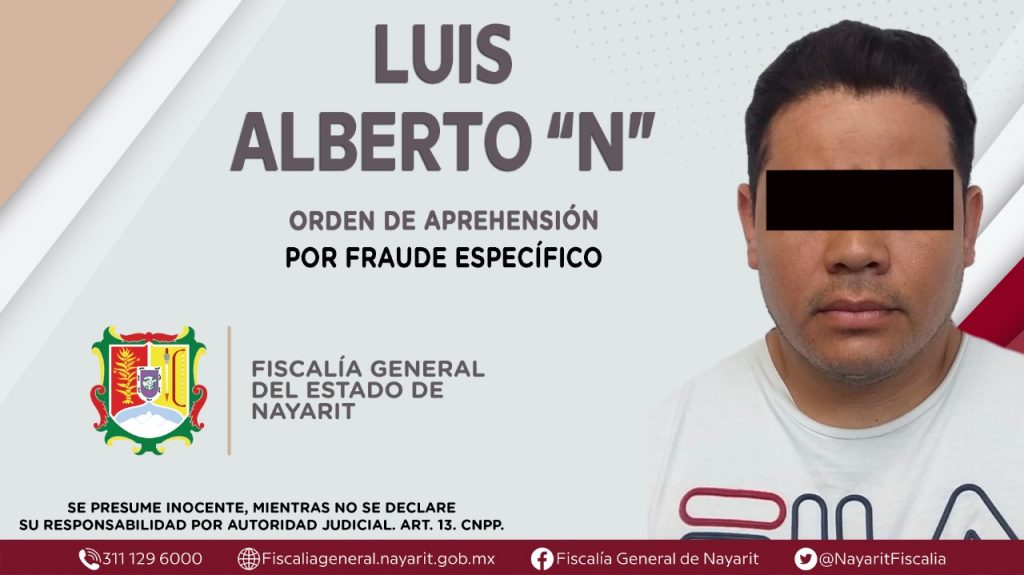 En la localidad La Cantera, municipio de Tepic, elementos de la Agencia de Investigación Criminal de Nayarit dieron cumplimiento a una orden de aprehensión que se obsequió contra Luis Alberto “N”, por su tentativa participación en hechos que la ley califica como delito de fraude específico, cometido en agravio de una persona de sexo femenino cuya identidad se reserva.