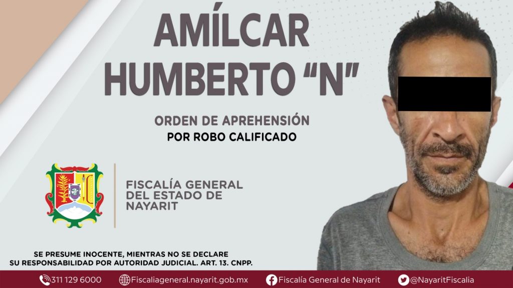 La Fiscalía General del Estado a través de la Agencia de Investigación Criminal dio cumplimiento a una orden de aprehensión en la ciudad de Tepic contra Amílcar Humberto “N”, por su presunta participación en hechos que según apreciación de la ley configuran el delito de robo calificado, cometido en agravio de una persona de sexo masculino de identidad reservada.