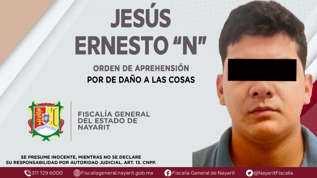 Elementos de la Agencia de Investigación Criminal cumplimentaron en la ciudad de Tepic una orden de aprehensión contra Jesús Ernesto “N”, por su presunta participación en hechos que según apreciación de la ley configuran el delito de daño a las cosas, cometido en agravio de una persona de sexo femenino cuya identidad es reservada.