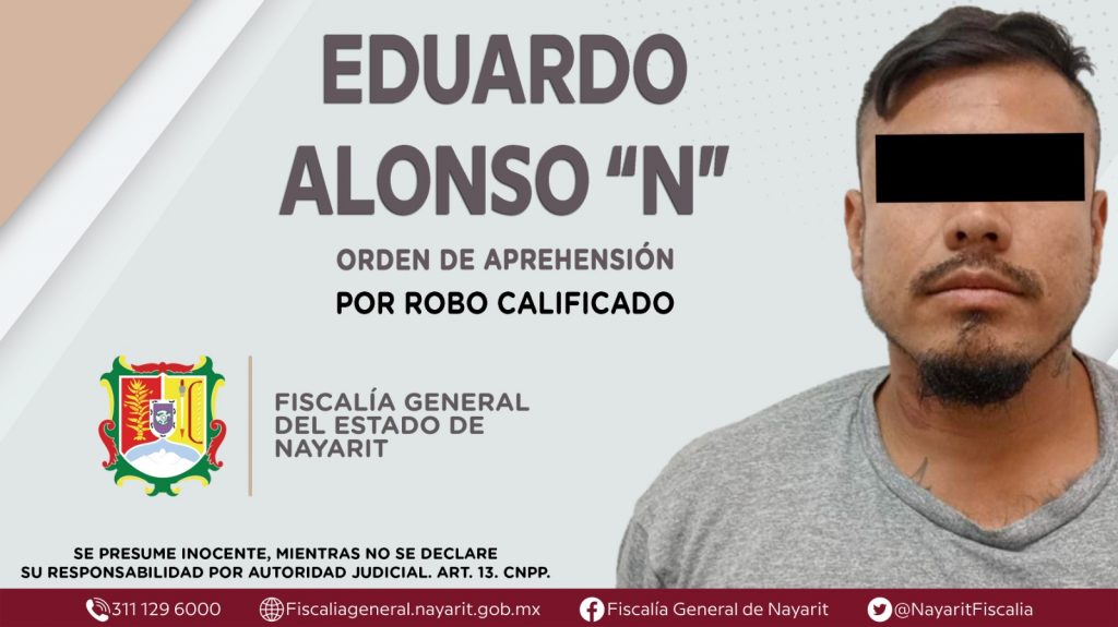 La Fiscalía General del Estado a través de la Agencia de Investigación Criminal dio cumplimiento a una orden de aprehensión en la ciudad de Tepic contra Eduardo Alonso “N”, por su presunta participación en hechos que según apreciación de la ley encuadran el delito de robo calificado, cometido en agravio de una persona de sexo masculino de identidad reservada.