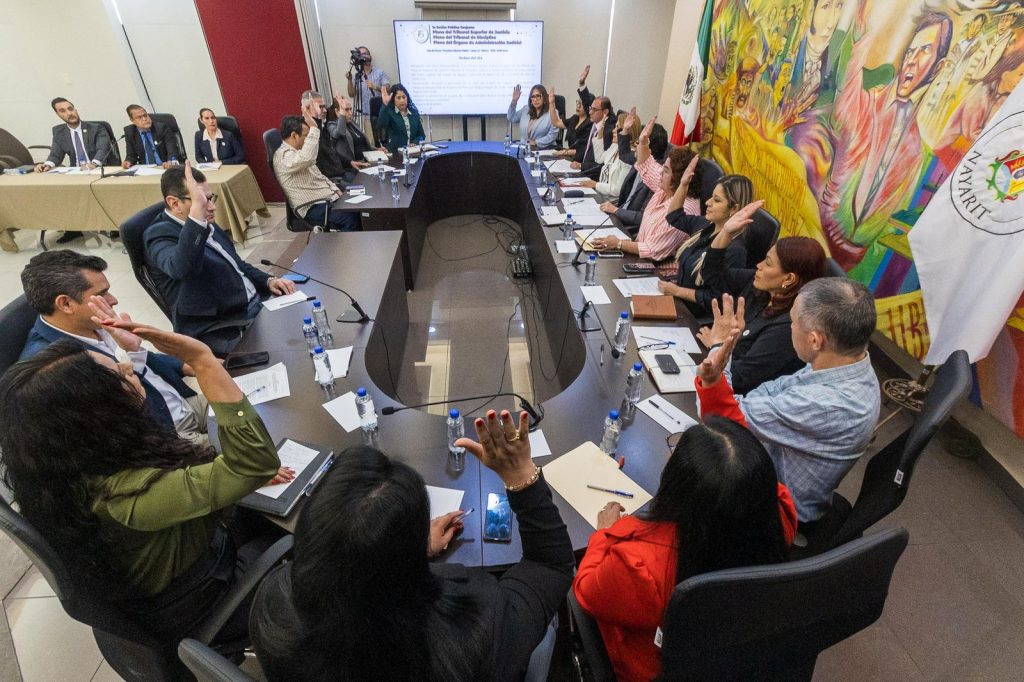 Las y los integrantes de los Plenos del Tribunal Superior de Justicia, del Tribunal de Disciplina Judicial y del Órgano de Administración Judicial aprobaron por unanimidad, en Sesión Pública Conjunta celebrada este jueves, el acuerdo mediante el cual se crea la Comisión Temporal responsable de proyectar el Plan Estratégico Integral del Poder Judicial del Estado de Nayarit 2025–2028.