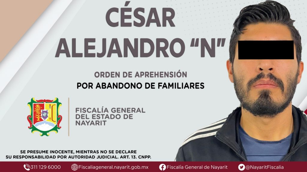 La Fiscalía General del Estado a través de la Agencia de Investigación Criminal dio cumplimiento a una orden de aprehensión en la capital nayarita contra César Alejandro “N”, por su presunta participación en hechos que según apreciación de la ley encuadran el delito de abandono de familiares, cometido contra un niño de identidad reservada.