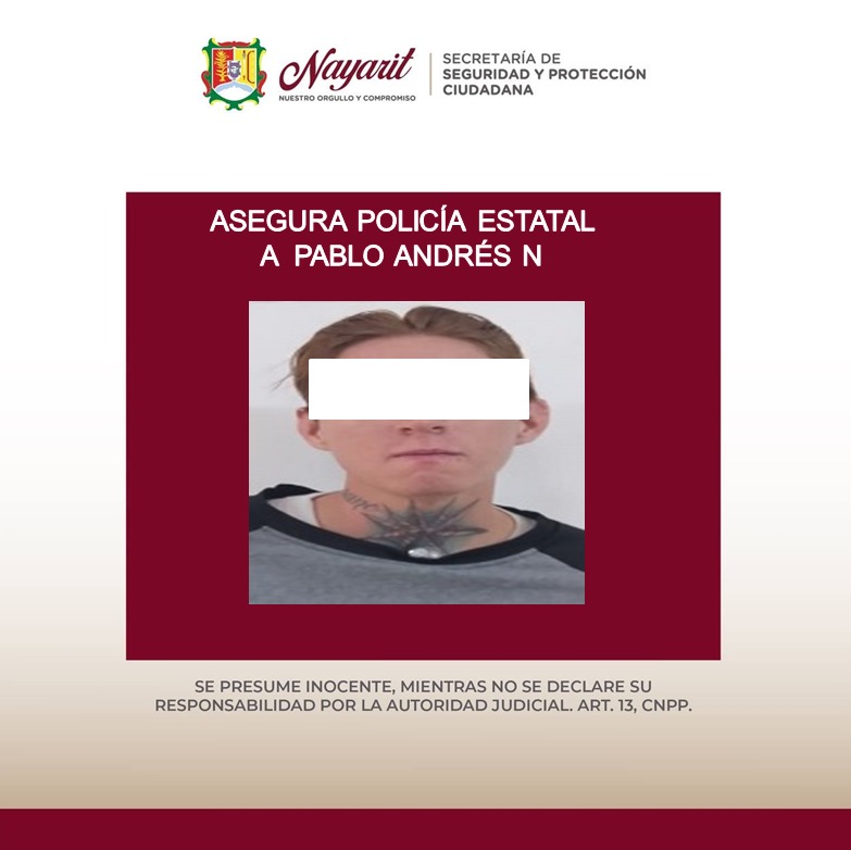 1.- Pablo Andrés “N” “N”, de 21 años, en la colonia Valle de Matatipac de Tepic, dando cumplimiento a la orden de aprehensión por su presunta participación en el hecho delictuoso de violencia familiar en agravio de una persona de sexo masculino.