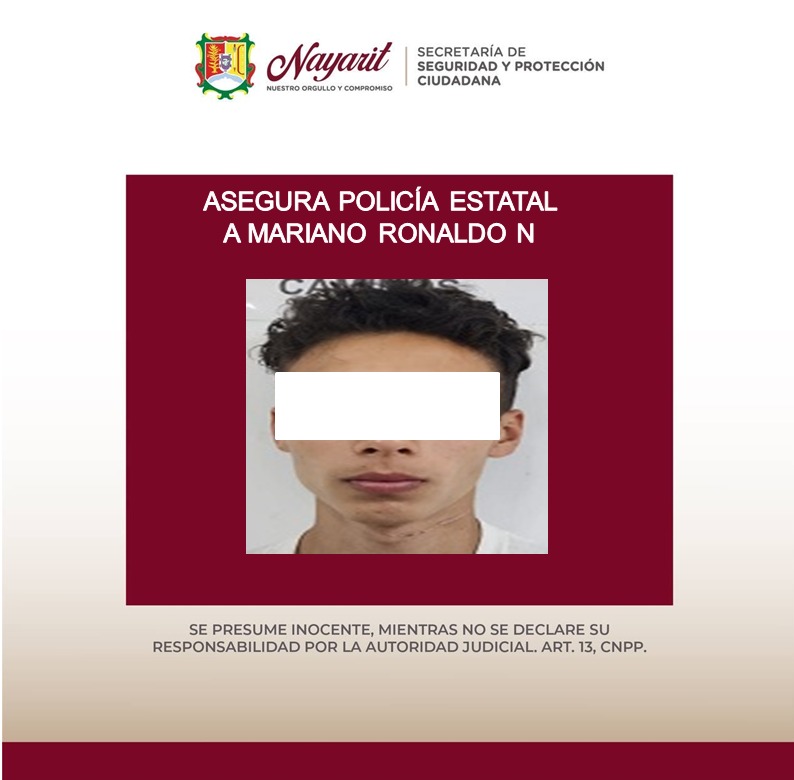 1.- Mariano Ronaldo “N” “N”, de 18 años, en Fraccionamiento Lomas de la Cruz de Tepic, asegurándole una bolsa de plástico conteniendo en su interior una sustancia cristalina y granulada con las características propias de la droga conocida como cristal.