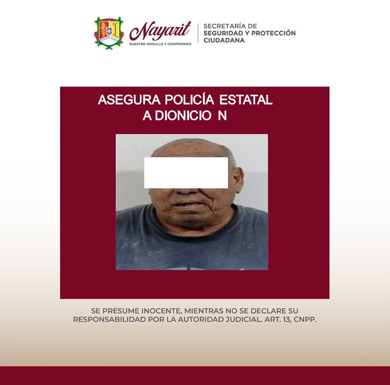 1.- Dionicio “N” “N”, de 68 años, en la colonia Santa Teresita, por su presunta participación en el hecho delictuoso de desobediencia y resistencia a particulares, en agravio de la sociedad por agredir física y verbalmente a elementos de la Policía Estatal, encontrando en el lugar 3 cartuchos percutidos de calibre .22 y un impacto de arma de fuego en la puerta de la entrada principal del domicilio.