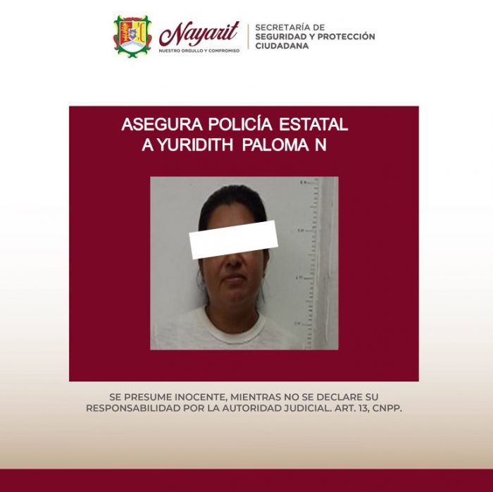 1.- Yuridith Paloma “N” “N”, de 33 años, en el bulevar Matanchen del municipio de San Blas, dando cumplimiento a la orden de aprehensión por su presunta participación en el hecho delictuoso de homicidio calificado en agravio de una persona de sexo masculino y cuatro personas más.