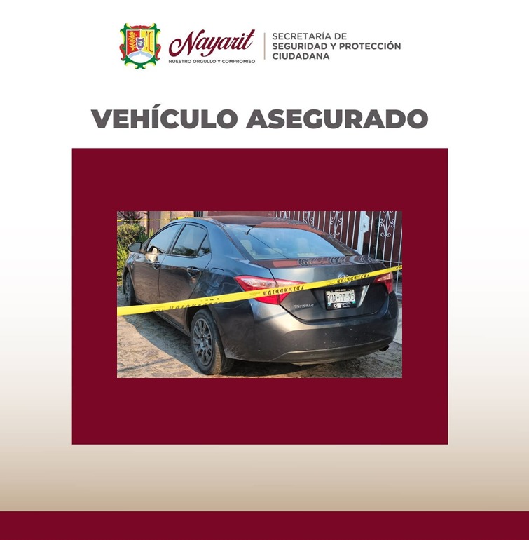 2.- Finalmente se aseguró un vehículo marca Toyota, sub-marca Corolla, tipo sedán, modelo 2017, en color gris, mismo que cuenta con reporte de robo además de encontrarse en estado de abandono, en la colonia Caminera durante recorridos de vigilancia y prevención al delito.