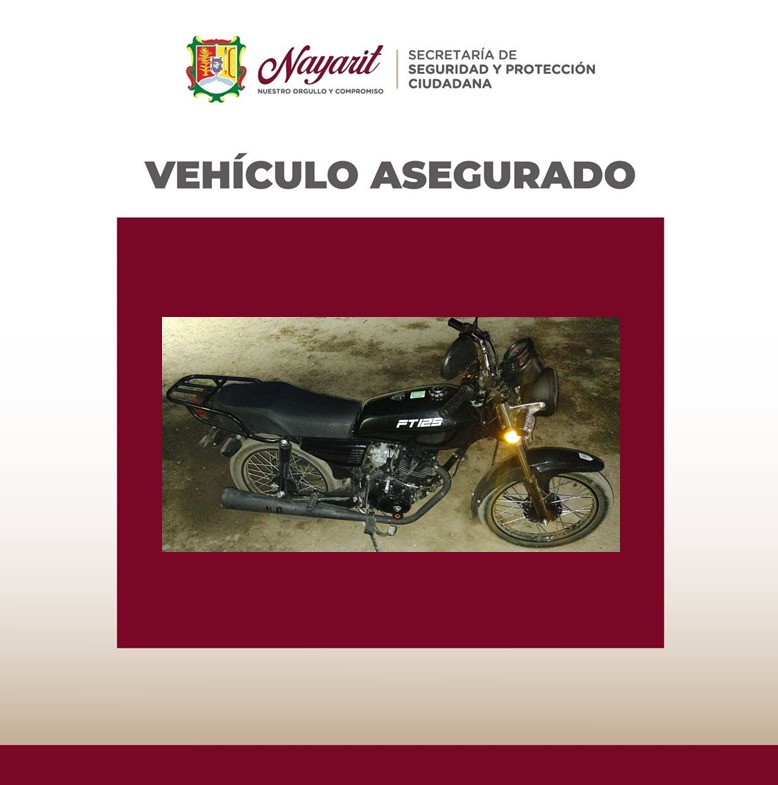 2.-Finalmente se aseguró una motocicleta de la marca Italika, sub-marca FT-125, en color negro, misma que se encontró en estado de abandono, esto en recorridos de vigilancia y prevención al delito en el fraccionamiento Villas del Parque.
