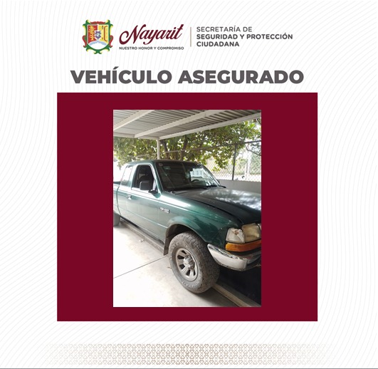 Se trata de una camioneta de la marca Ford, sub marca Ranger, en color verde, modelo 2000, la cual contaba con documentación apócrifa, asegurada en las instalaciones de REPUVE de la localidad de Jarretaderas, en el municipio de Bahía de Banderas.