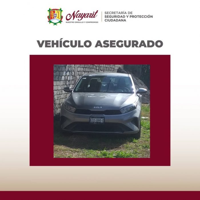 Elementos de la Policía Estatal de la Secretaría de Seguridad y Protección Ciudadana aseguran un vehículo en la localidad de San Cayetano del municipio de Tepic.