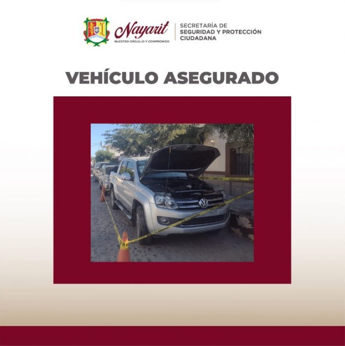 Elementos de la Policía Estatal de la Secretaría de Seguridad y Protección Ciudadana aseguran un (1) vehículo, en las instalaciones de REPUVE en la localidad de San Juan de Abajo, municipio de Bahía de Banderas.